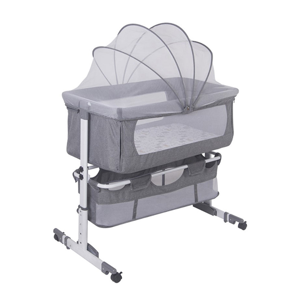 Baby bed, adjustable height, with fastening strap, mosquito net, wheels